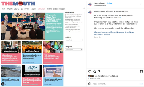 As a new profile, I think the most valuable posts were the ones which engaged with other accounts. For example, I re-tweeted the launch announcement on Truthfal's account to redirect the existing audience to our page. On the Instagram post of our website, I tagged the organisations that featured in those stories, such as Surfers Against Sewage and Tate St Ives, who subsequently liked the post. This created the potential for these organisations to reshare our post and grow our audience and engagement.